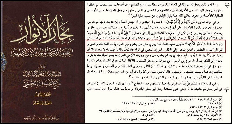 Во-вторых, Мухаммад Бакир Маджлиси в приведённом скрине рассматривает аяты о поклонении идолам. Вот полная цитата, обрезанная ваххабитом: «И в словах Аллаха: «А кто не ведёт прямым путем, кроме как сам является ведомым» имеются в виду идолы, которые не идут прямым путем и не ведут по нему никого, ибо они — мёртвые предметы из камня или подобного этому. Однако слова Корана ниспосланы так, что если их поведут прямым путем — они пойдут прямым путем, и это потому, что они (многобожники), взяв их себе богами, относились к ним как к живым существам, которые могут разуметь, хотя они не были таковыми на самом деле. Разве ты не видишь слова Аллаха: «Поистине, те, кого вы призываете помимо Аллаха, — рабы, подобные вам!«, «Зовите же их, пусть они вам ответят, если вы правдивы! Разве у них есть ноги, на которых они ходят?«, «Если вы зовете их, они не слышат вашего зова, а если бы слышали, то не ответили бы вам«. Тут Он сказал о них такими словами, какими говорят о тех, которые знают. И говорят, что тут подразумеваются ангелы и джинны, и говорят, что это правители и предводители заблуждения, которые призывают к куфру».