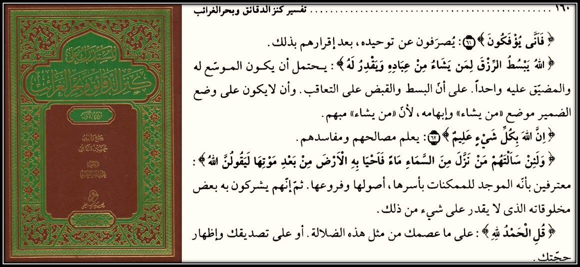 Тоже самое в тафсире «Канз ад-Дакъаикъ в бахр аль-Гъараиб»: «Они признавали, что Он создатель всех творений, основ и ответвлений…»