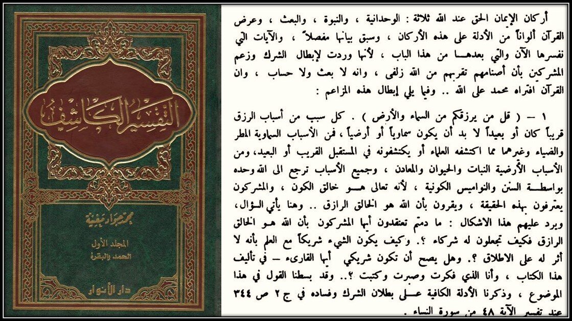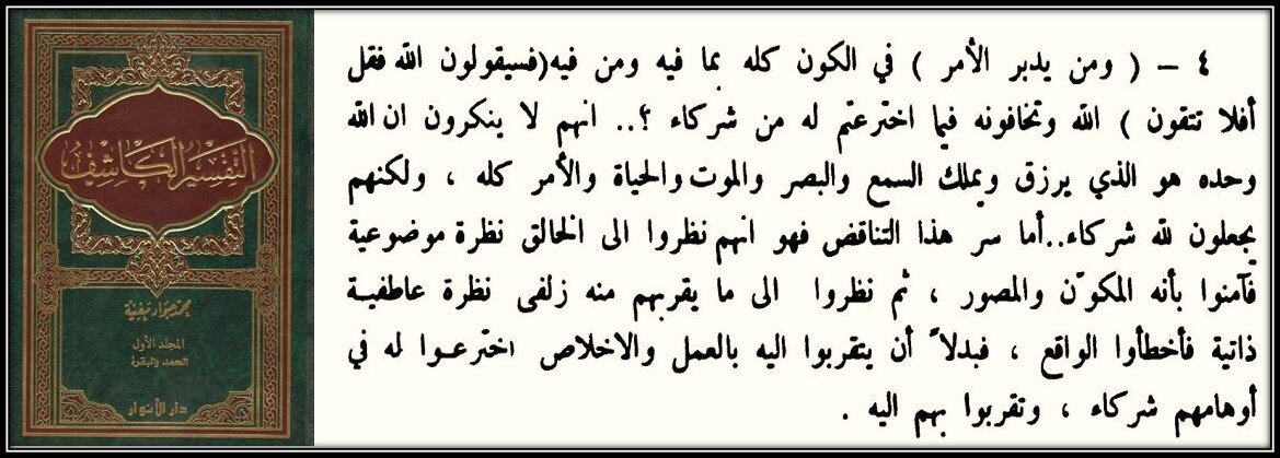 Откроем «Тафсир аль-Кашиф» в толковании 31-го аята суры «Юнус»: «Кто управляет делами» в этом быту, и во всем том, что в нем? «Они скажут: Аллаh» разве вы не боитесь Его в том, что придали ему сотоварищей? Они не отрицали, что один лишь Аллаh дает пропитание, дает слух и зрение, дает и забирает жизнь, что Он управляет всем, но они все равно придали Ему сотоварищей… Затем они посмотрели на то, что может приблизить их к Нему… вместо того, чтобы приблизиться к нему благими деяниями, выдумали в своем представлении сотоварищей, и начали приближаться к Нему посредством них».