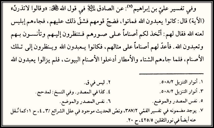 Также в муфассир ‘Али аль-Къумми признает, что ширк появился по причине того, что праведникам сначала установили возвеличивающий их образ, и когда они поклонялись Всевышнему, смотрели на эти образы, напоминавшим им тех праведников. Т.е мушрики изначально сделали идолы для в честь тех праведников, чтобы эти идолы напоминали им о них.