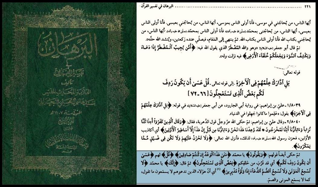 Тоже самое говорит другой авторитетный муфассир, Хашим аль-Бахрани, в своей тафсире «аль-Бурхан»: «О Мухаммад! Те, которых ты призываешь, не слышат то, что ты говоришь, как и обитатели и глухонемые не слышат».