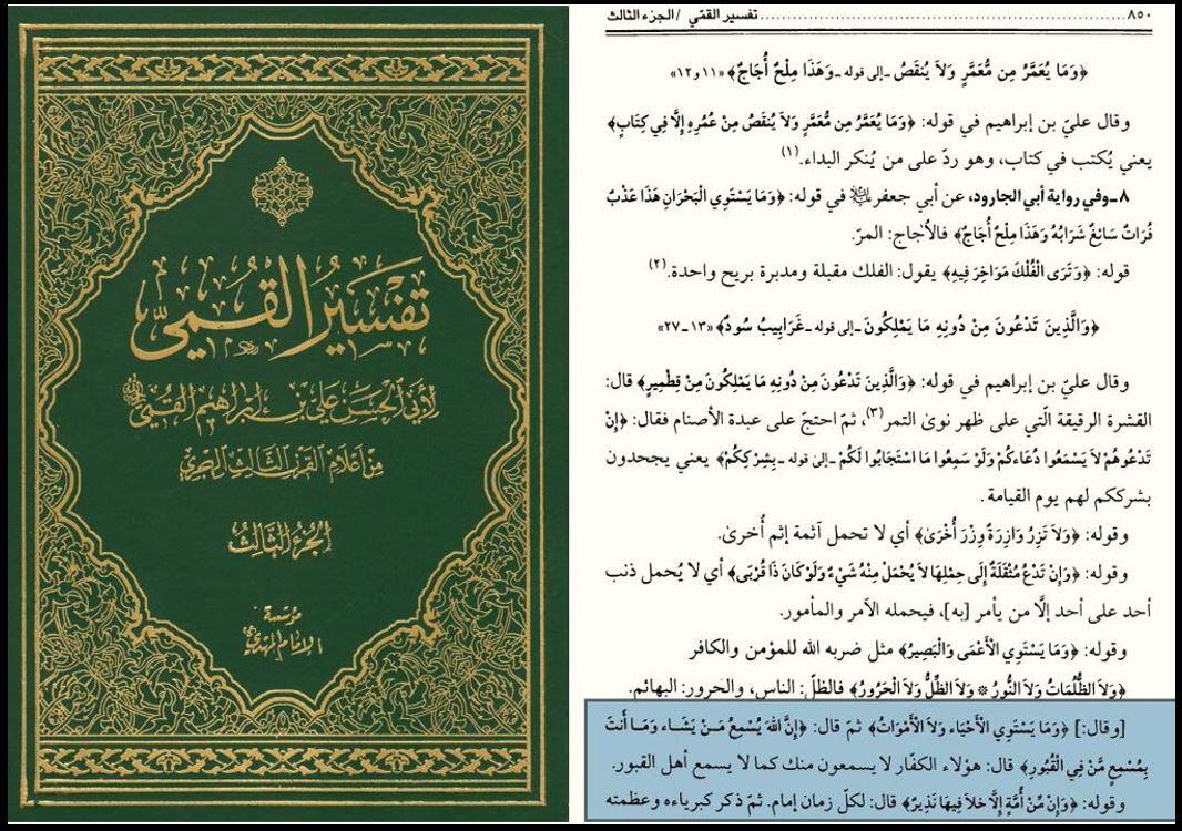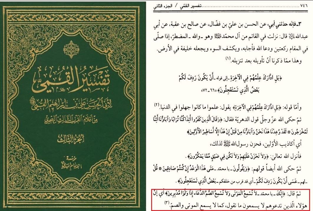 Также аль-Къумми в толковании аята: «…ты не заставишь слышать обитателей могил» сказал: «Кафиры не слышат тебя, как и не слышат тебя мертвые».
