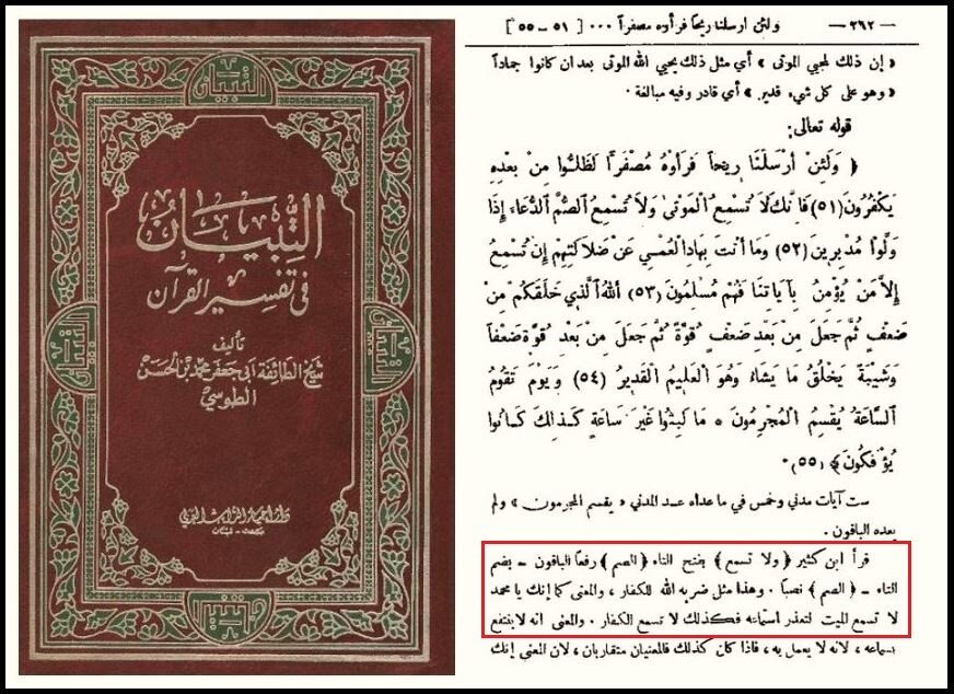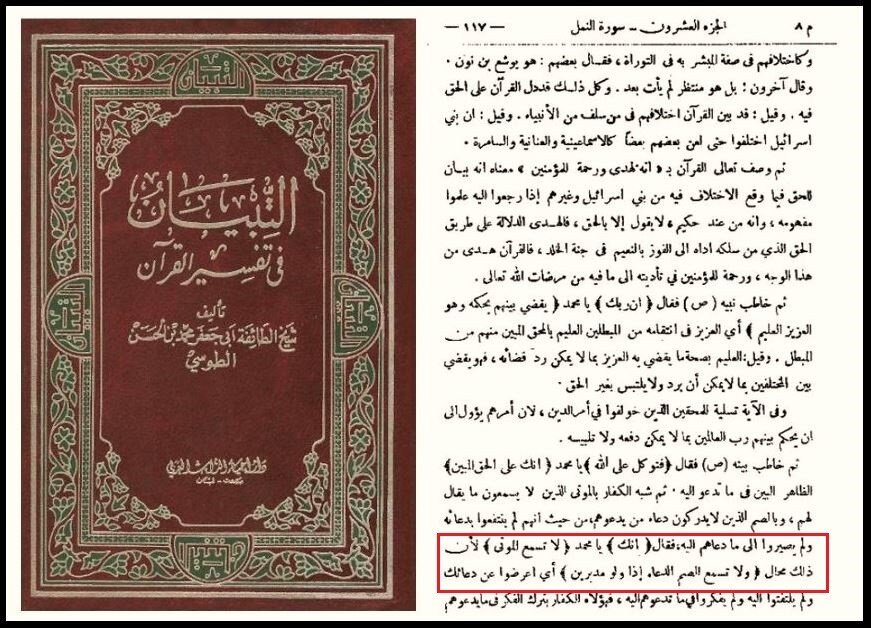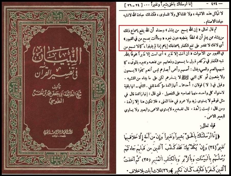 Другой выдающийся шиитский муфассир, Абу Джа’фар ат-Туси, в толковании аята «… ты не заставишь мертвых слышать» сказал: «Ибо это невозможно».