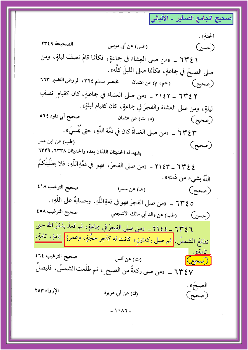 Посланник Аллаха (С) сказал: «Кто прочитает утренний намаз с джамаатом, а потом сядет и будет поминать Аллаха до восхода солнца, а затем прочитает два ракята намаза, — награда того будет равна награде хаджа и умры, полностью, полностью, полностью».